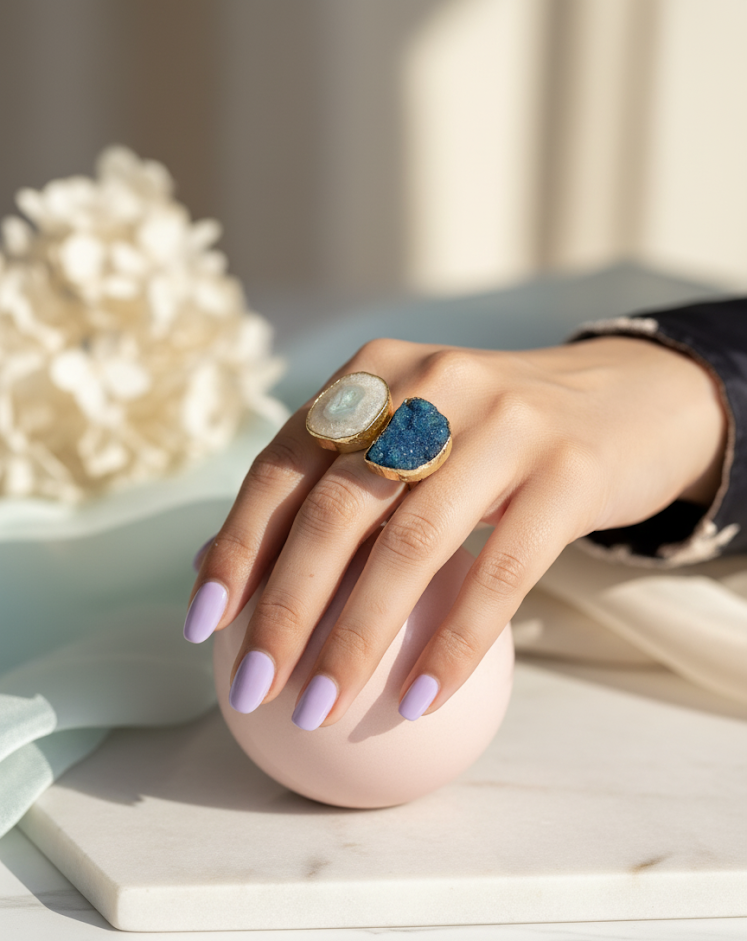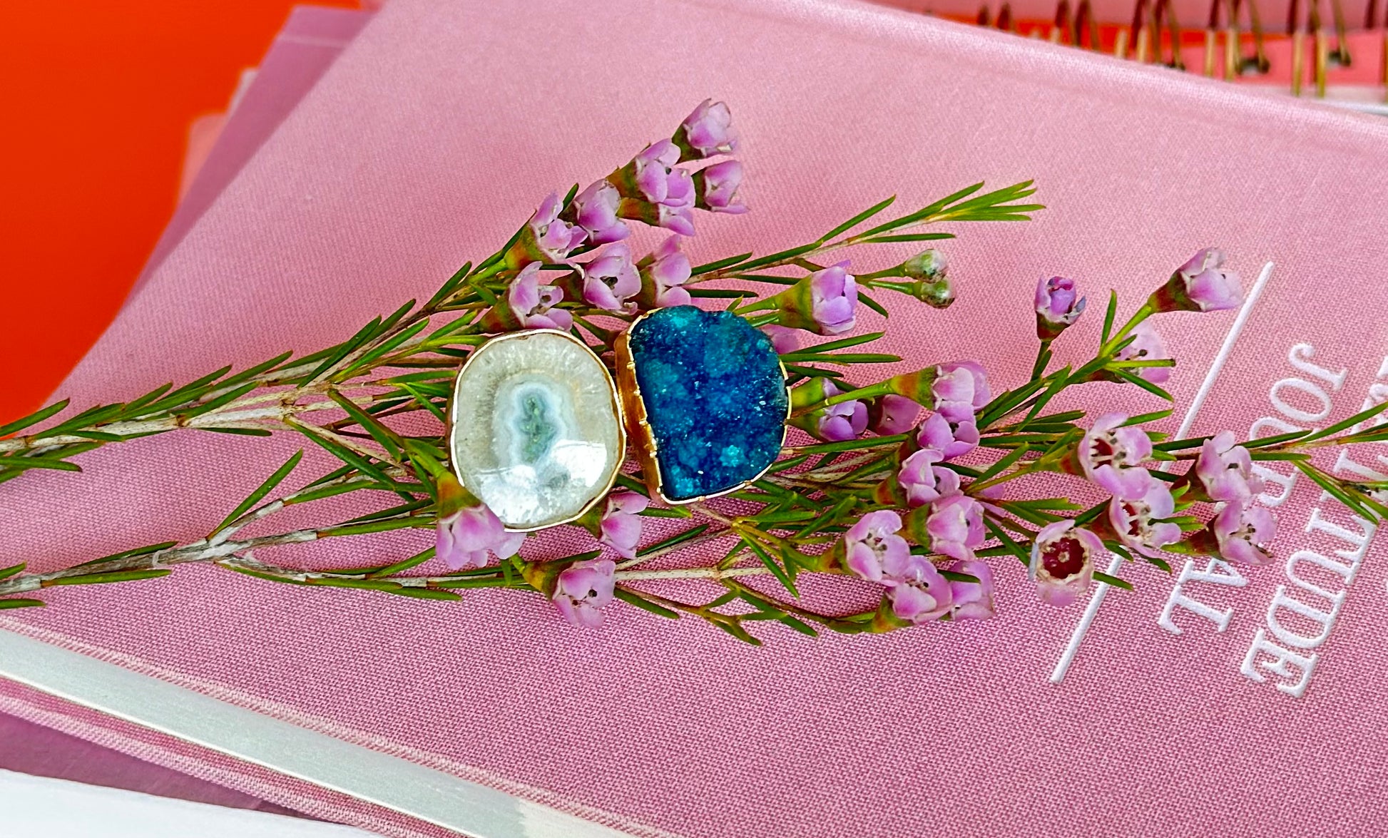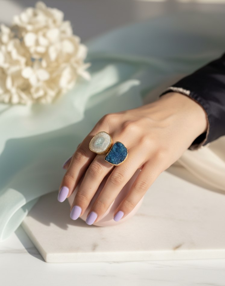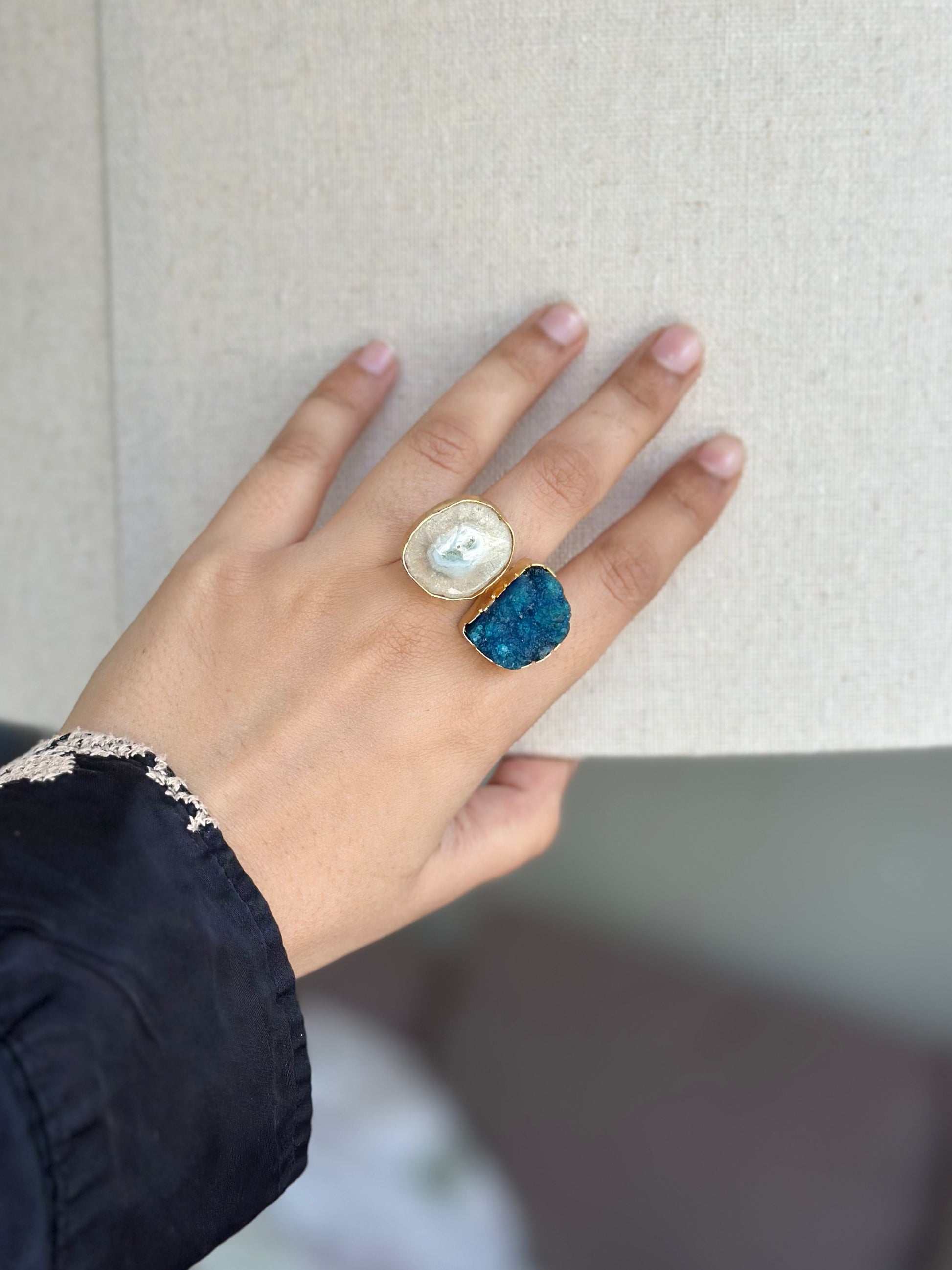 Two natural druzy stones sit side by side: an icy oval and a deep blue half moon, each framed in warm gold tone brass. The open band is adjustable and comfortable. A striking, sparkling ring that goes from denim days to evening dinners.