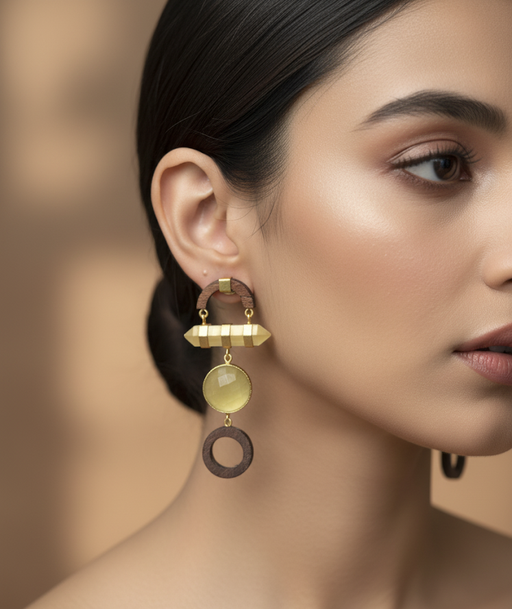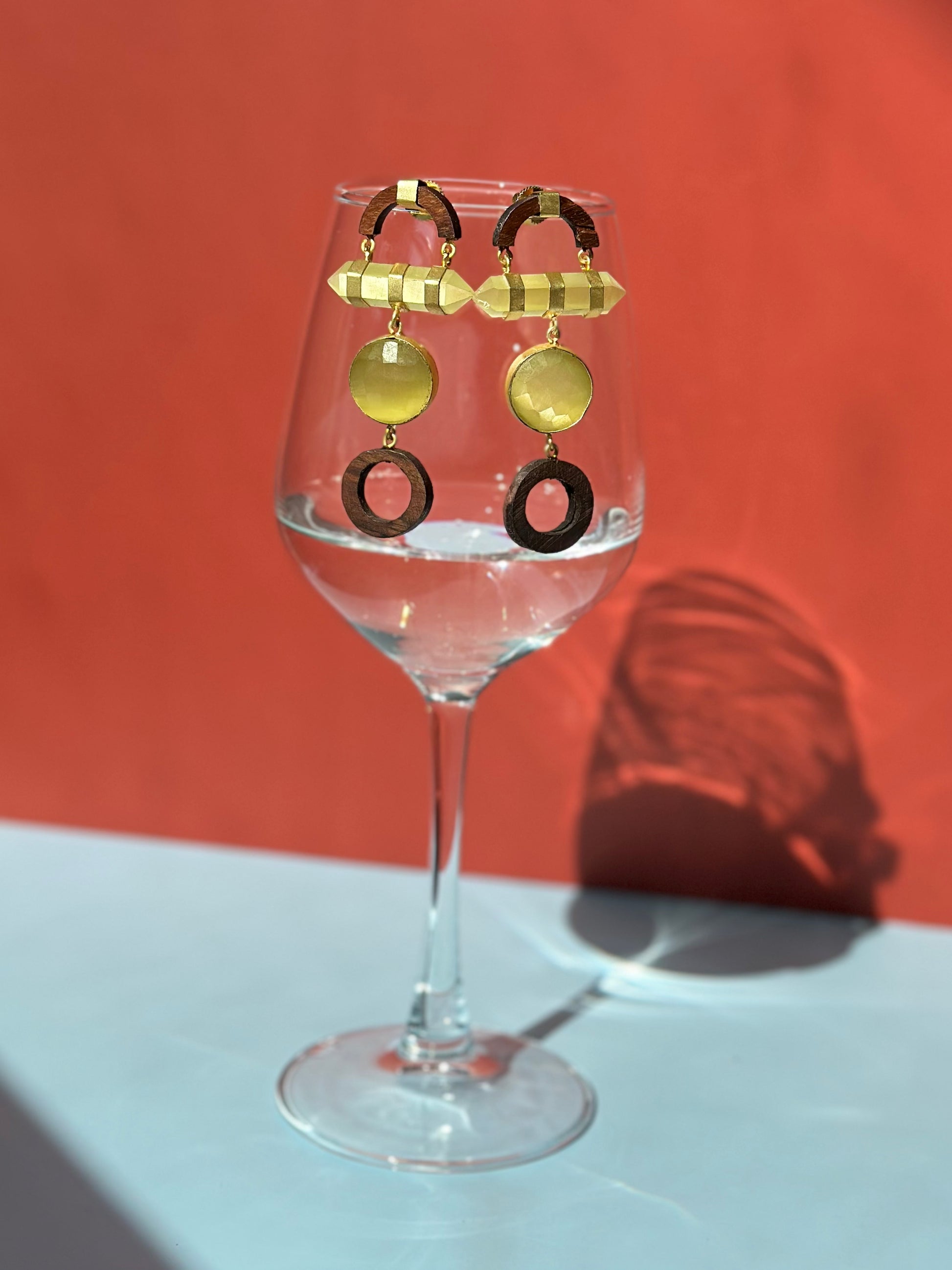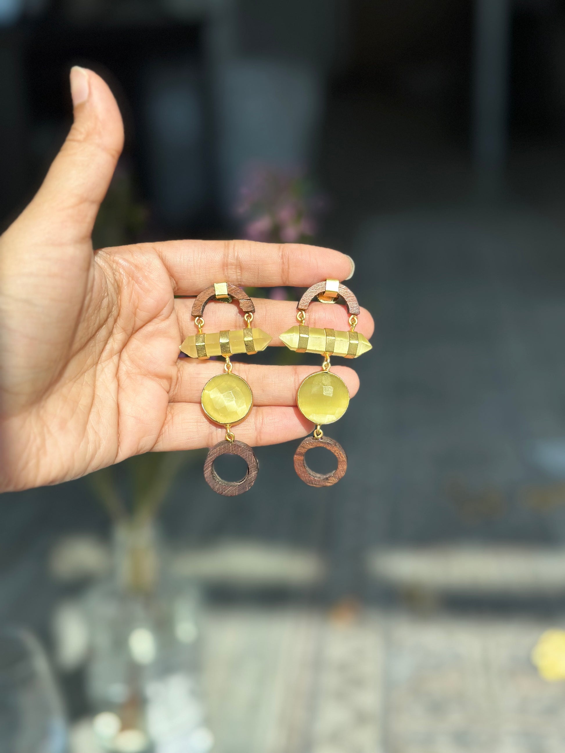 An arc of warm wood, a faceted lemon toned resin, and gold tone brass charms create a playful tiered drop. Light swing and soft glow with comfortable post backs. Statement without weight for day to dinner. Natural textures meet warm metal for a modern boho feel.