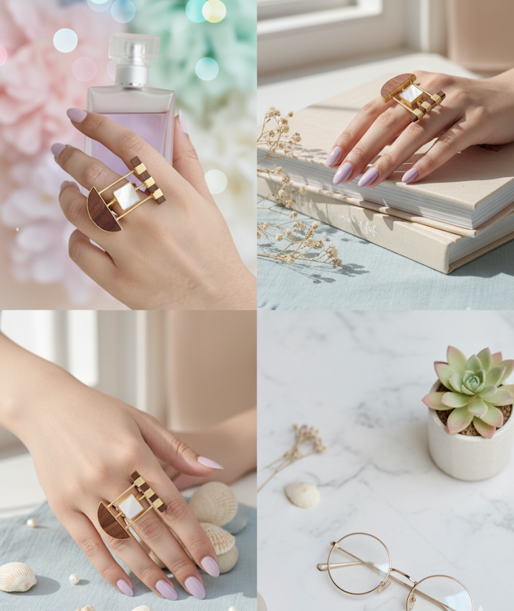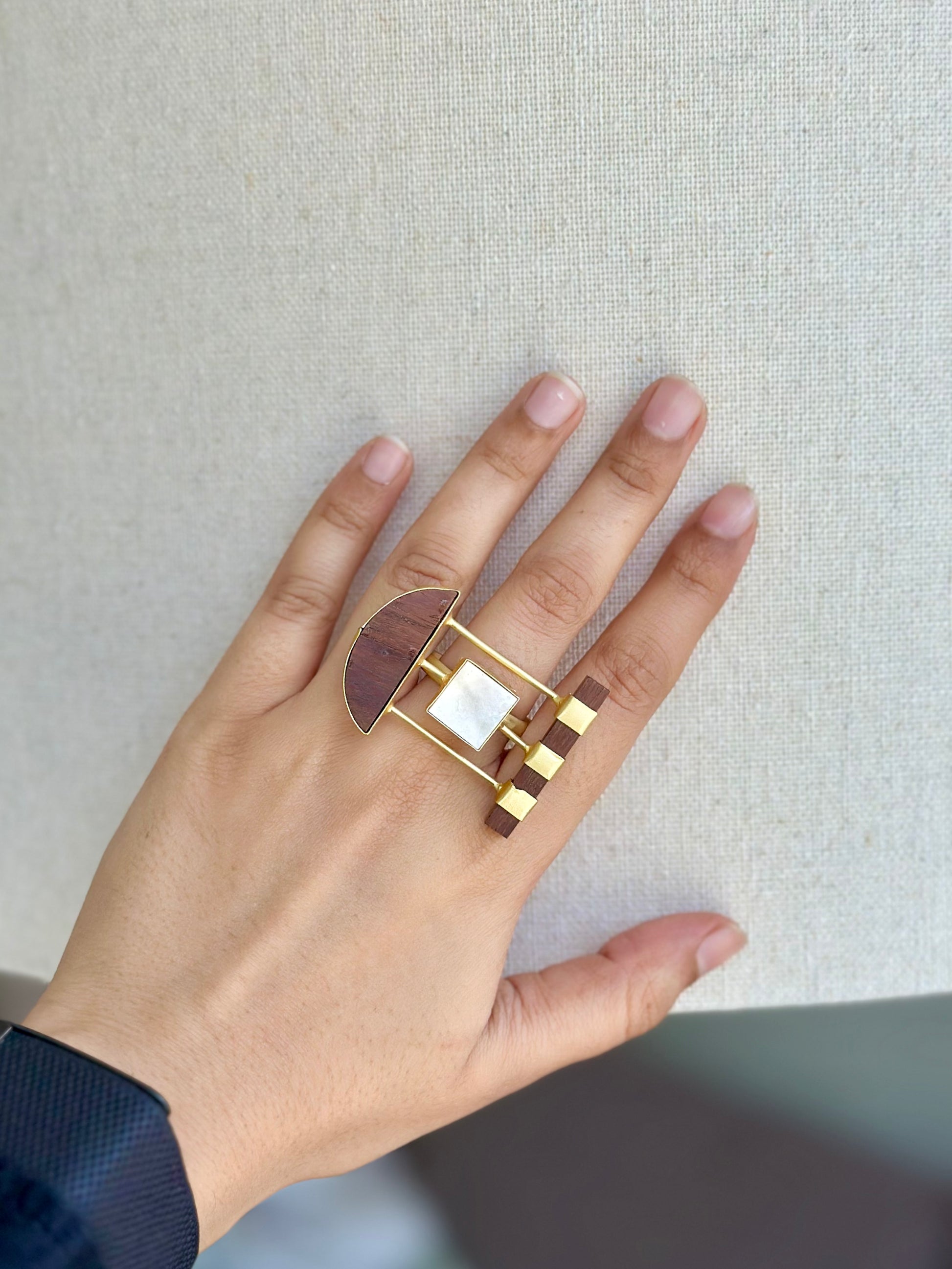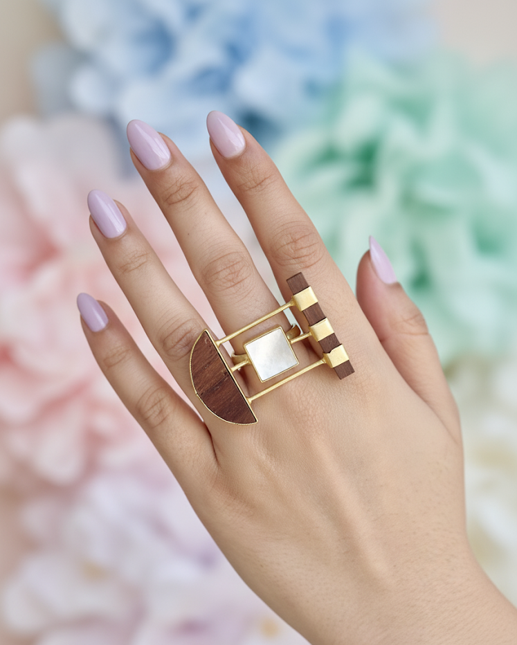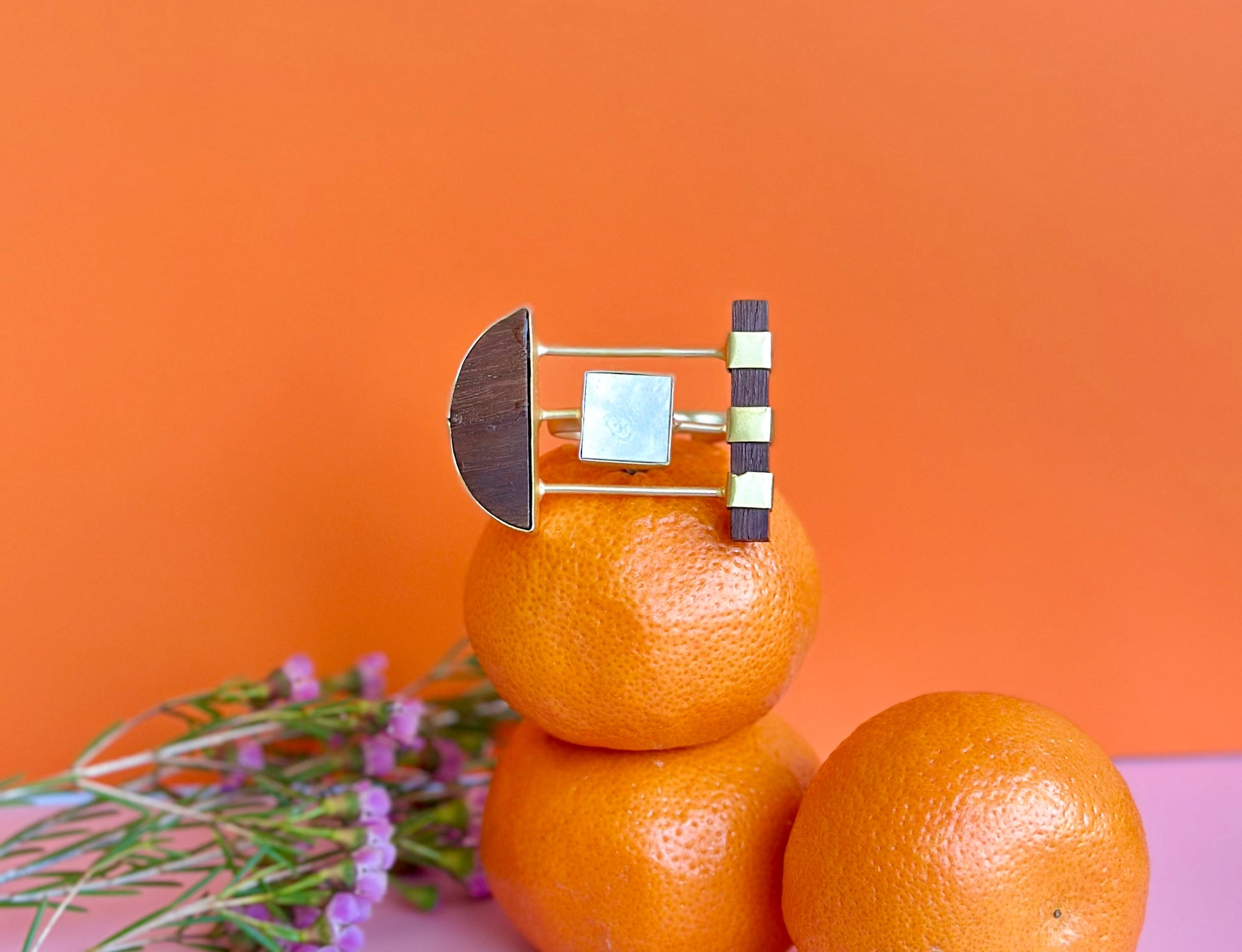 Geometric and graceful, Ivoria pairs warm wood with gold tone brass. A glossy white square sits at the center, balanced by a half moon accent and stepped bars. The sculptural top makes a soft statement while the band feels smooth and comfortable.