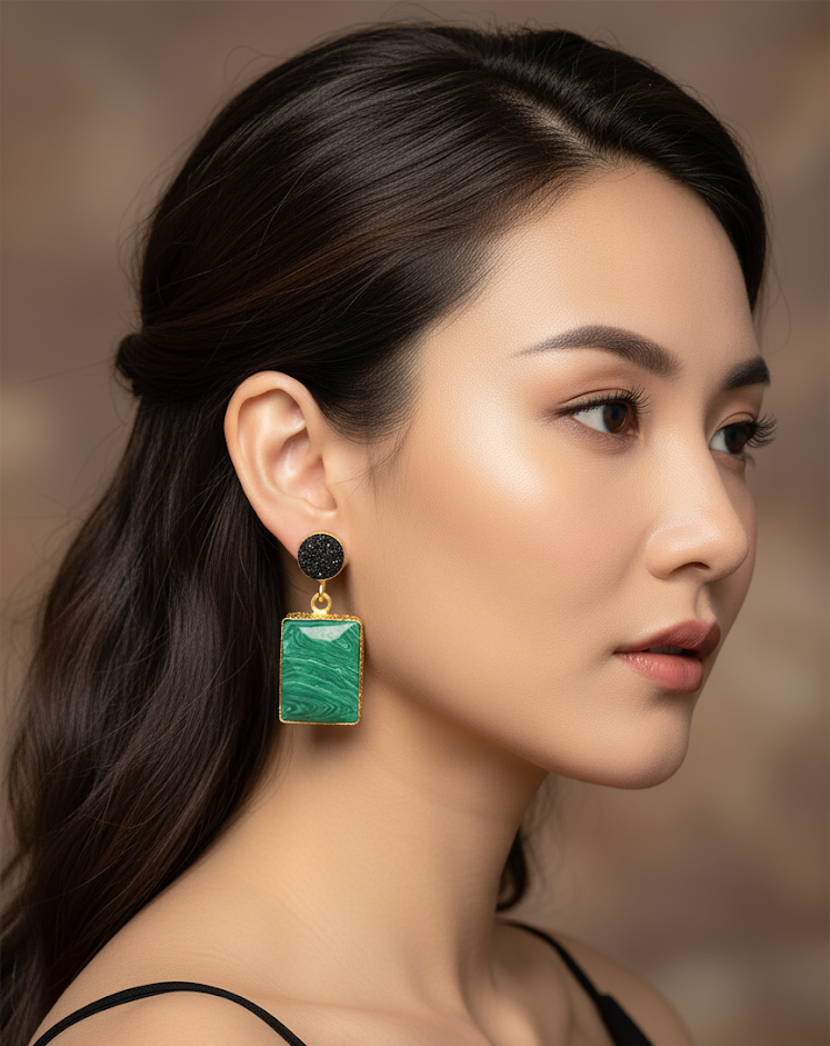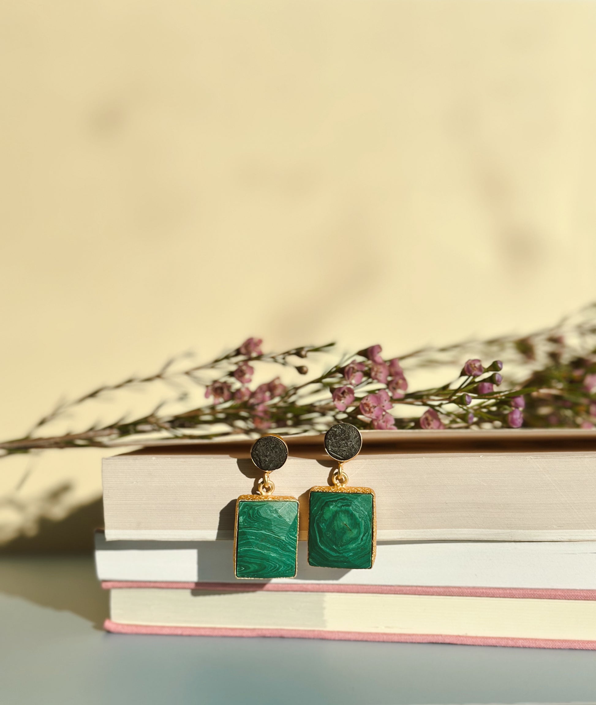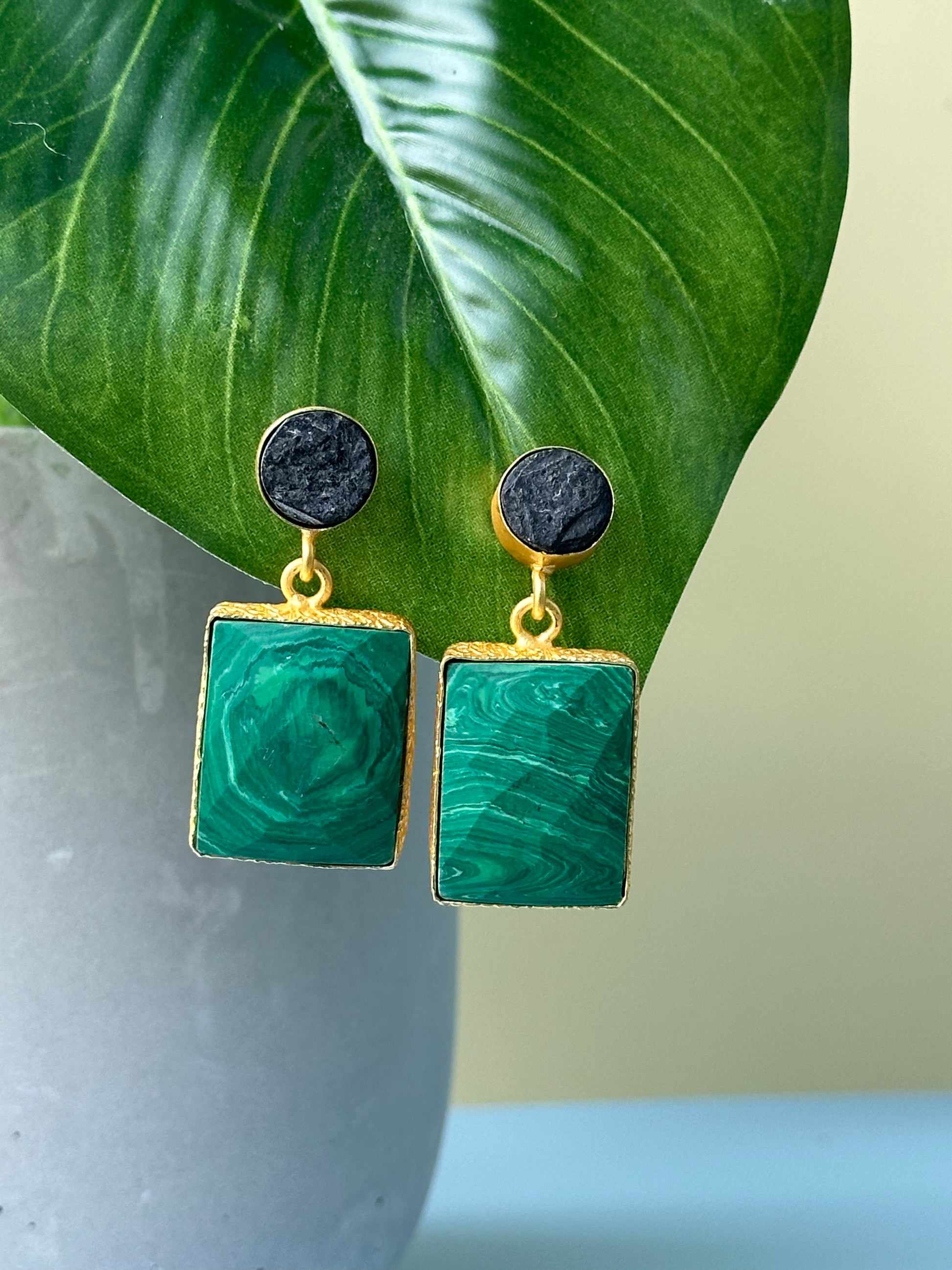 Rectangular green stone drops meet a black druzy stud, framed in warm gold tone brass. The malachite look feels lush while the silhouette stays light. Comfortable post backs. An easy statement for nights out, weddings, and gifting, finished in gift ready packaging.