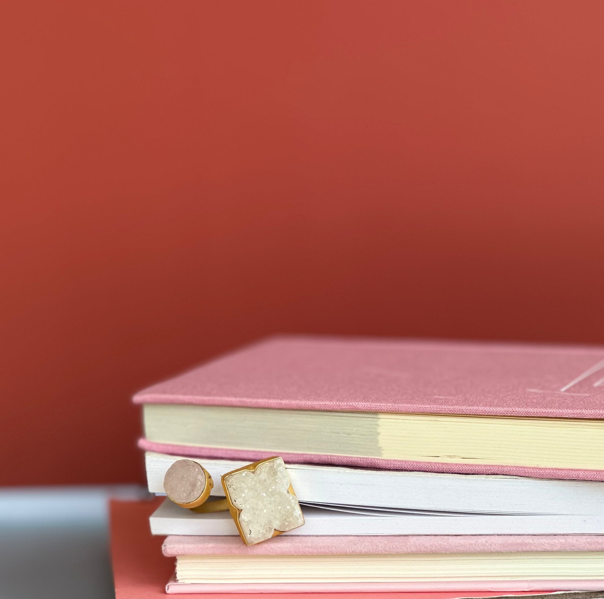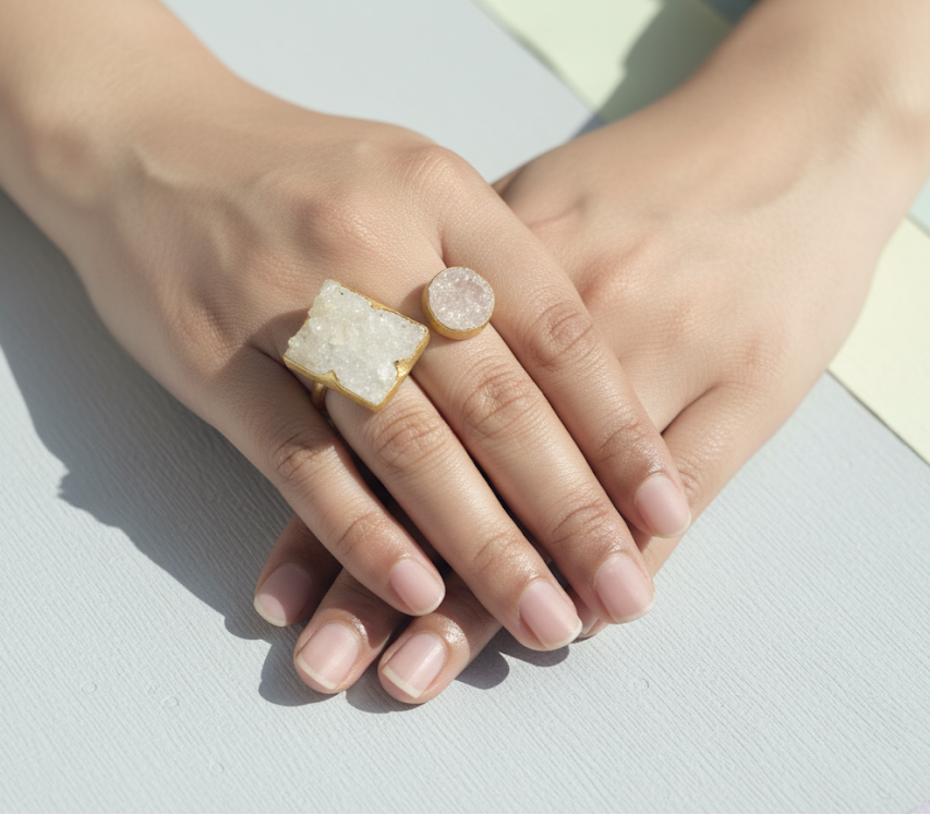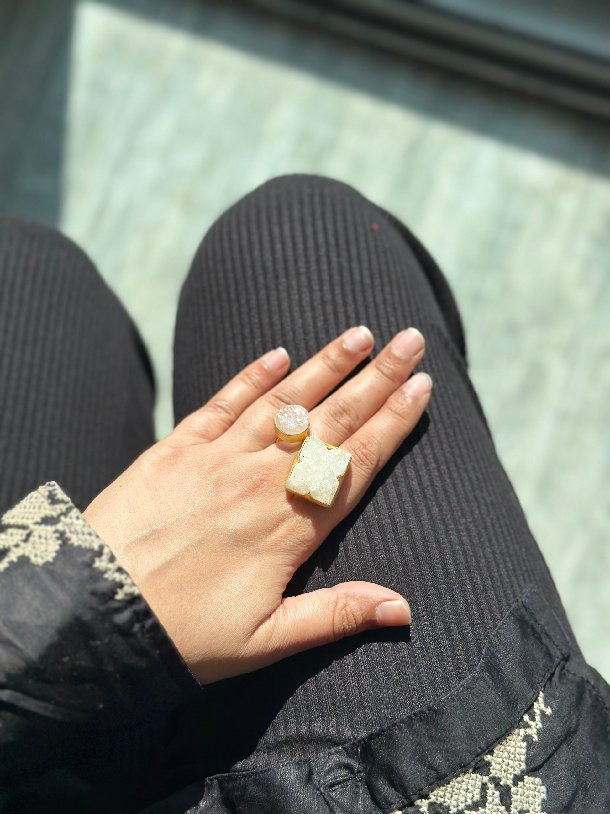 Two druzy stones share one sculptural ring. A freeform icy white and a soft blush round sparkle in warm gold tone brass. The twin top feels bold yet wearable and sits comfortably on the hand. From daytime denim to dinners.