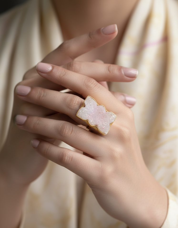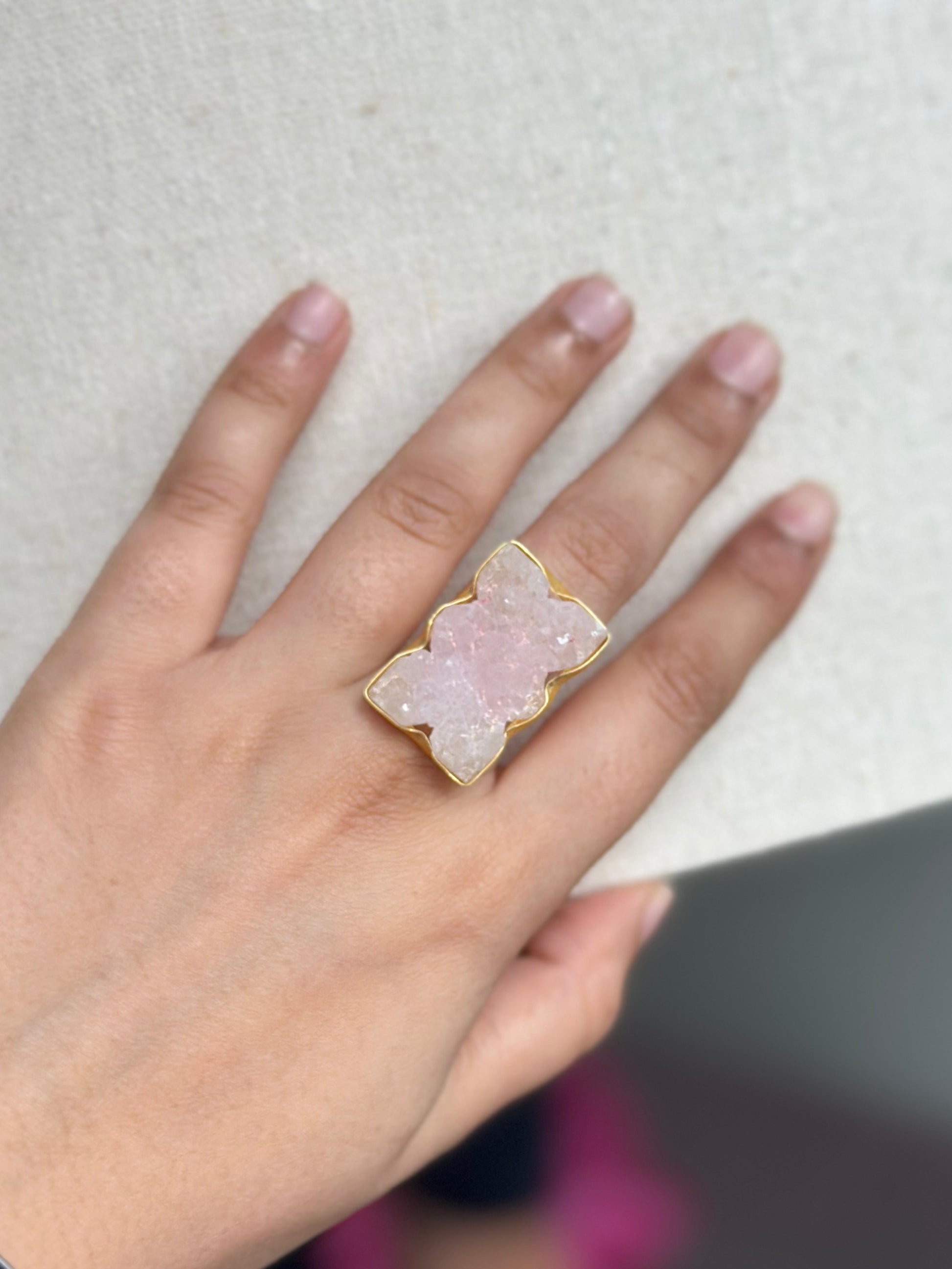 A soft blush druzy forms a sculpted butterfly silhouette, framed in warm gold tone brass. The crystal catches light with gentle sparkle, making a sweet statement on the hand. The band adjusts for a comfortable fit. Lovely for brunch, parties, and gifting.