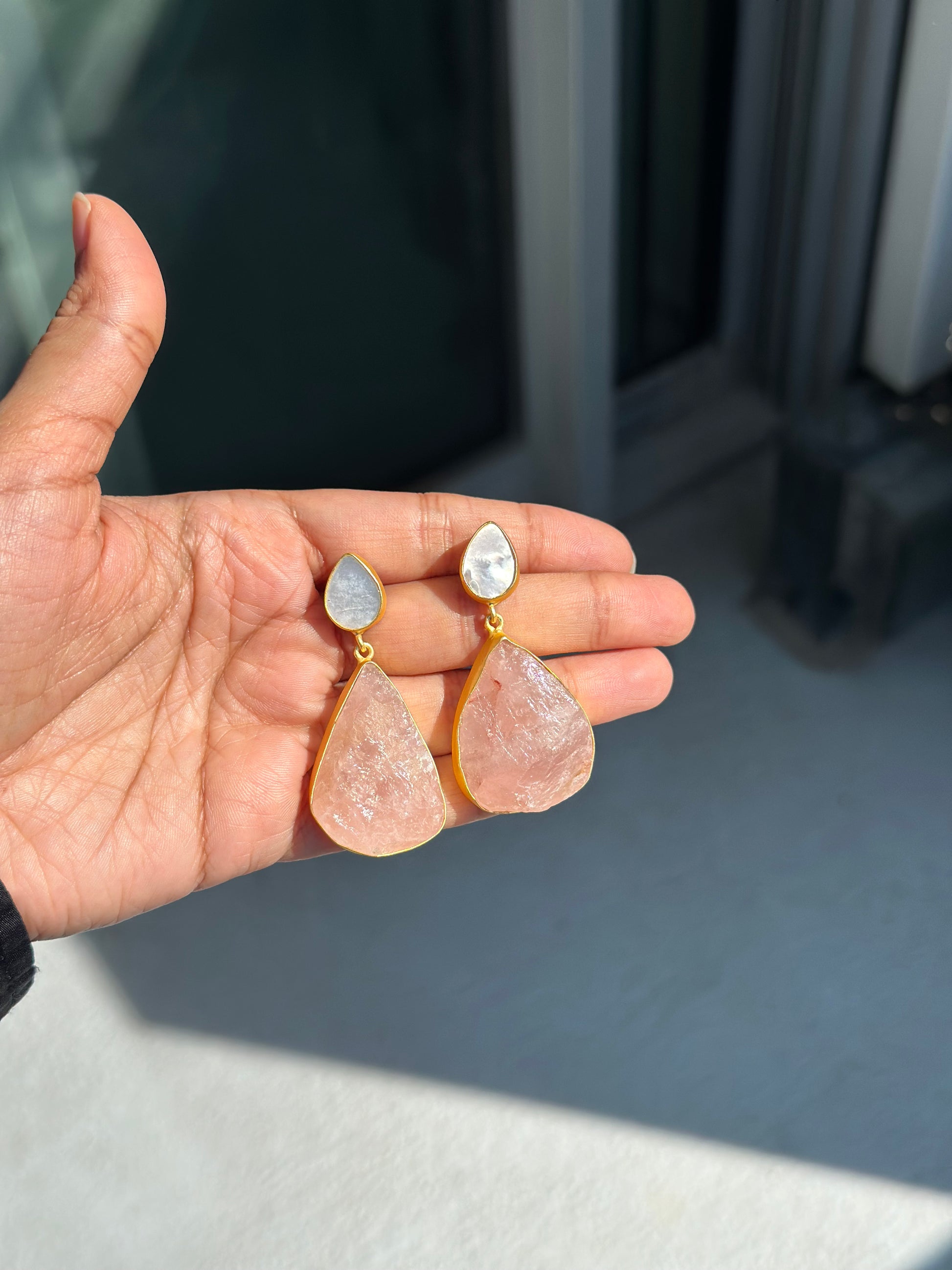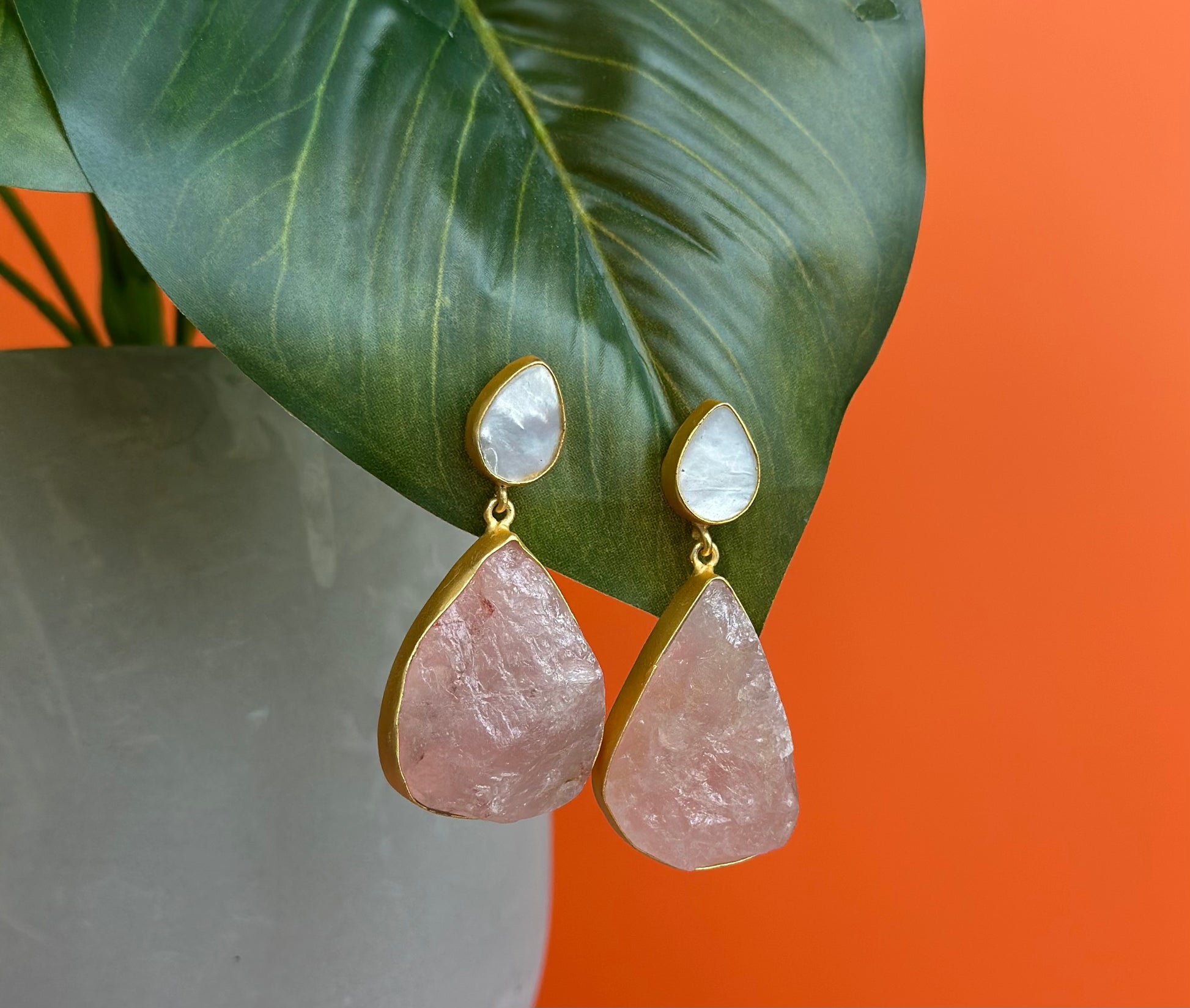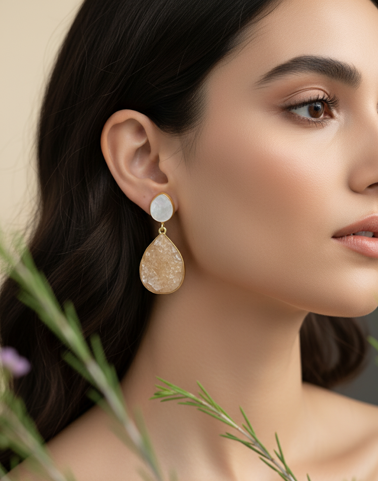 Soft white resin marble stud meets a pear shaped champagne quartz drop. The natural sparkle and warm gold tone brass frame create a gentle glow that suits day to evening. Light on the ear with secure post back, easy statement for weddings, dinners, gifting.