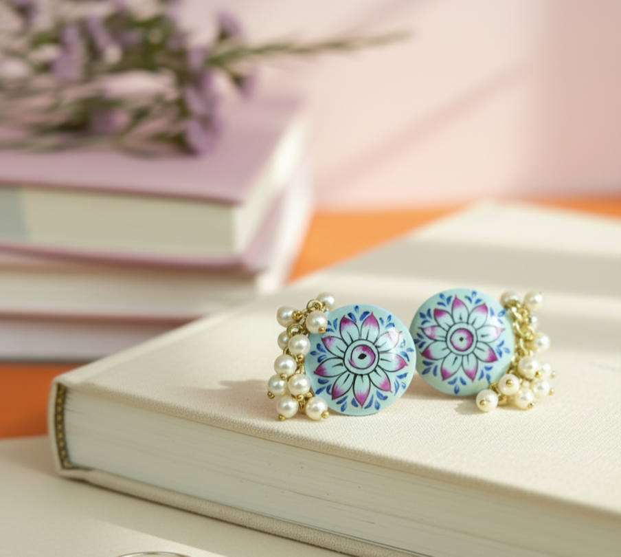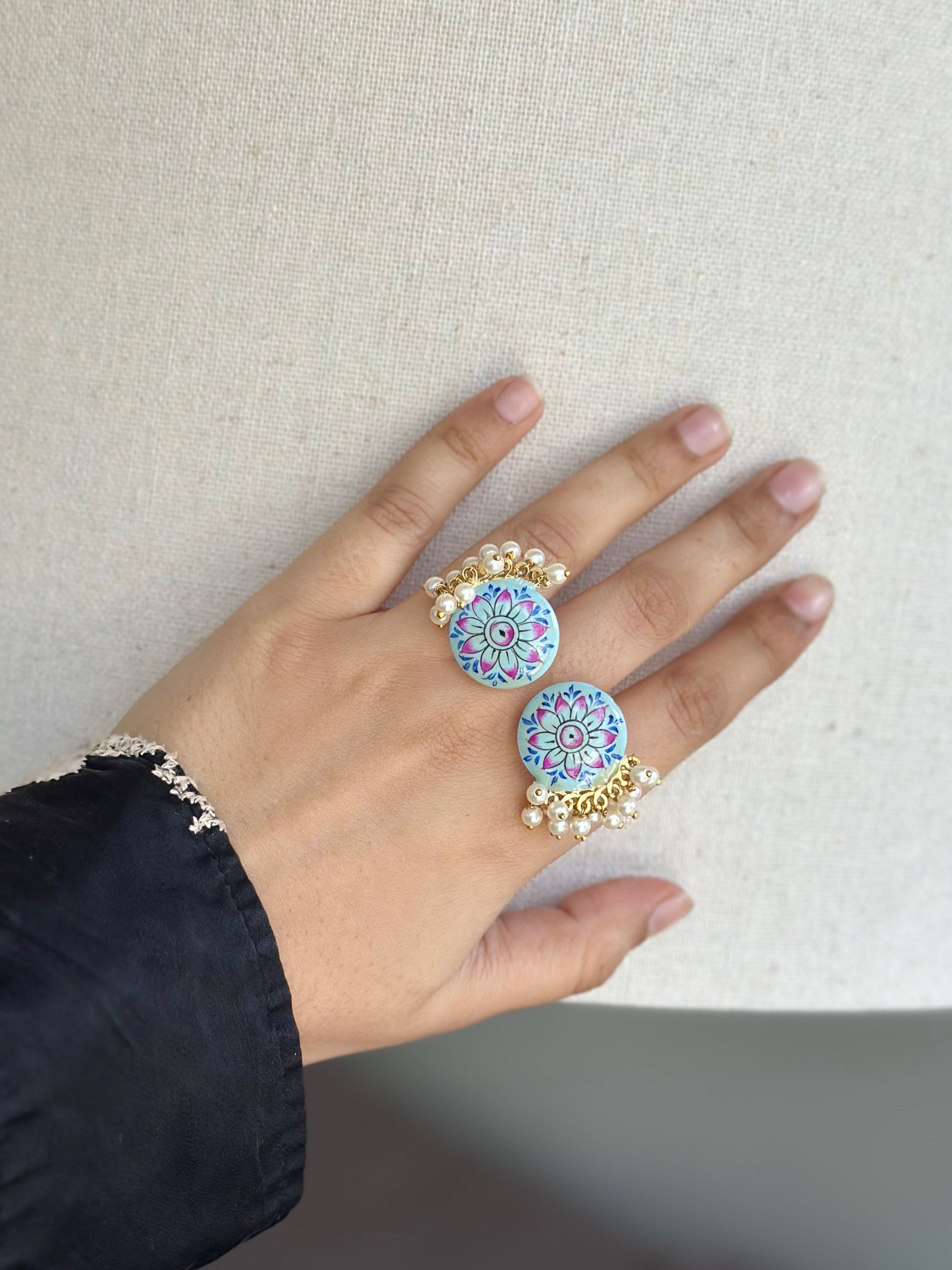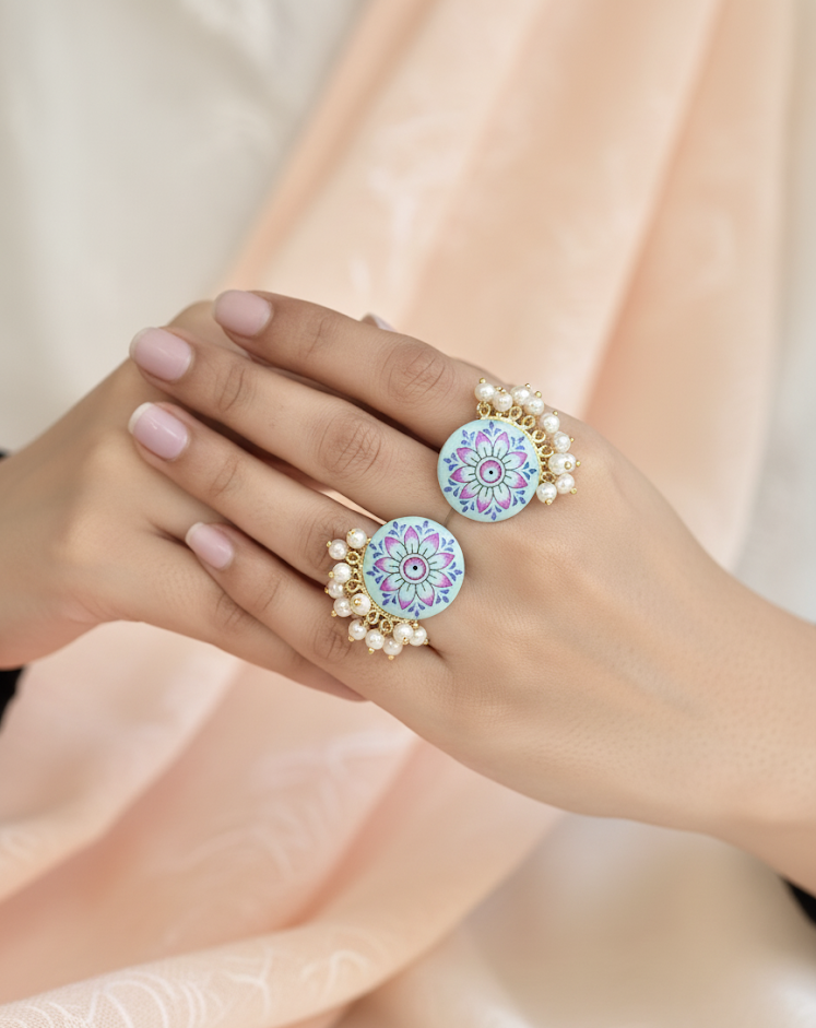 A round enamel disc blooms with a blue-lilac mandala, finished with a fringe of tiny pearls. Set in warm gold-tone brass, the ring feels playful yet elegant. The open band adjusts for comfort, making it an easy statement from day events to festive nights.