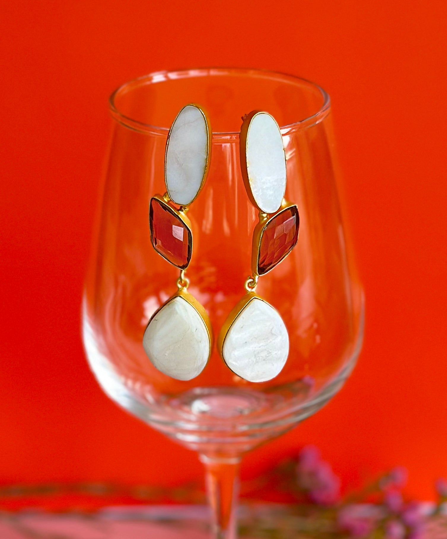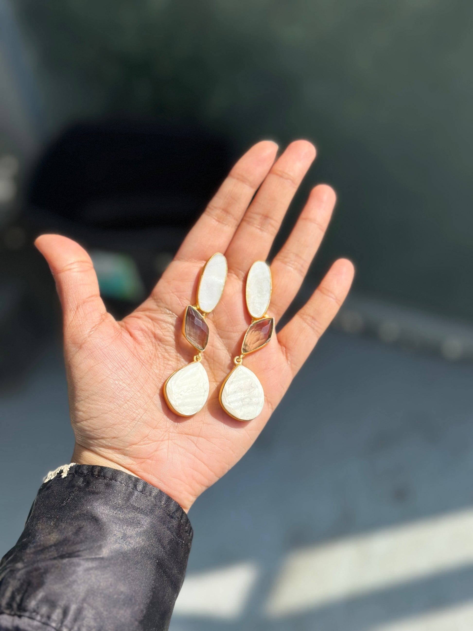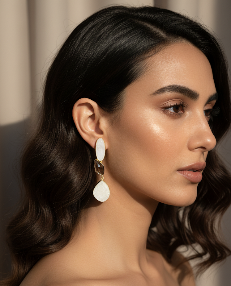An oval white stone sits at the ear, linked to a smoky faceted square and a soft white teardrop. The trio glows in warm gold tone brass and feels light to wear. Secure post backs. Easy from daytime to dinners and weddings.