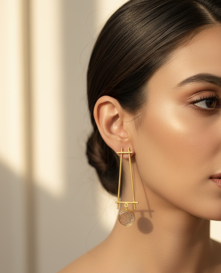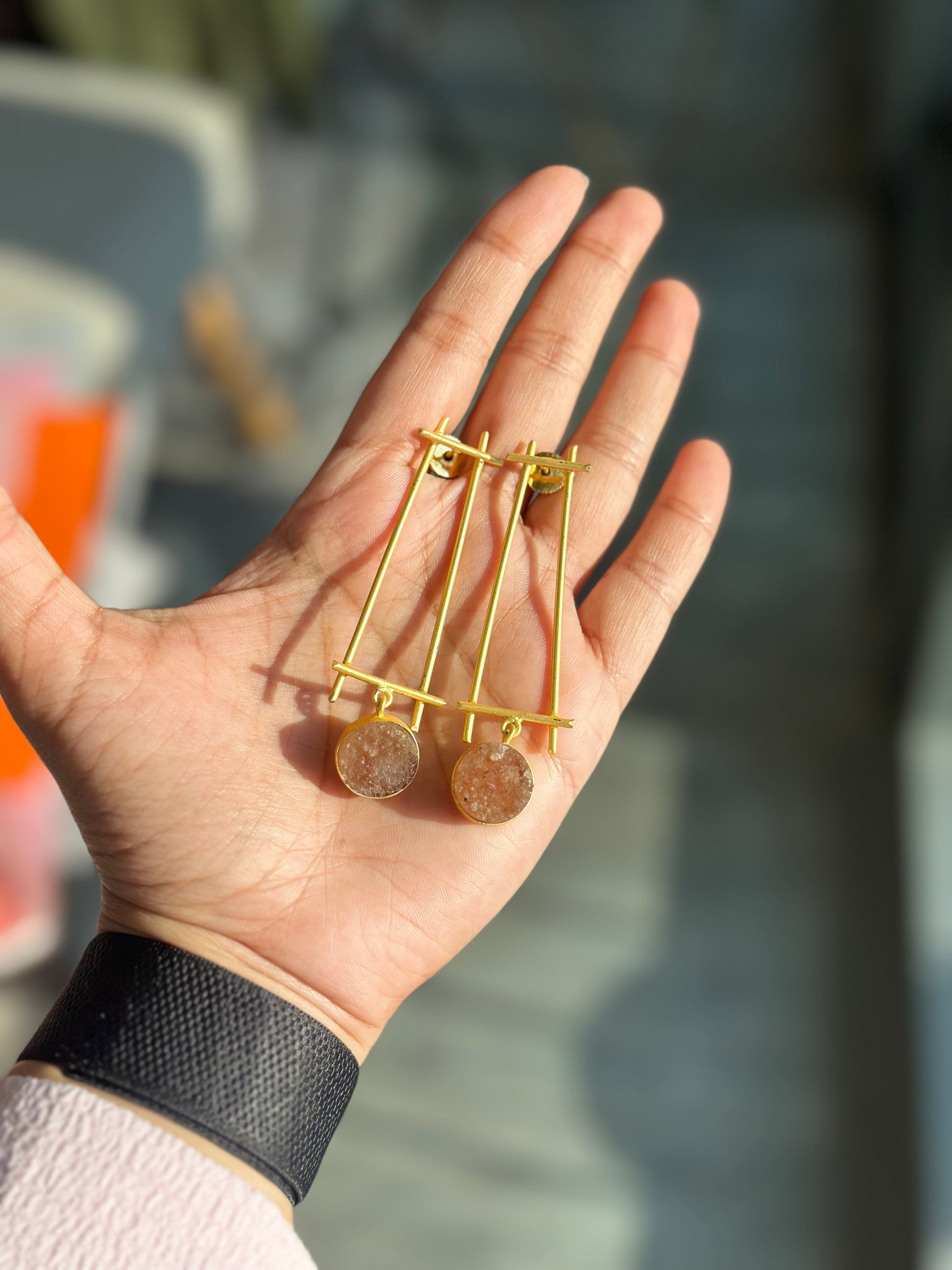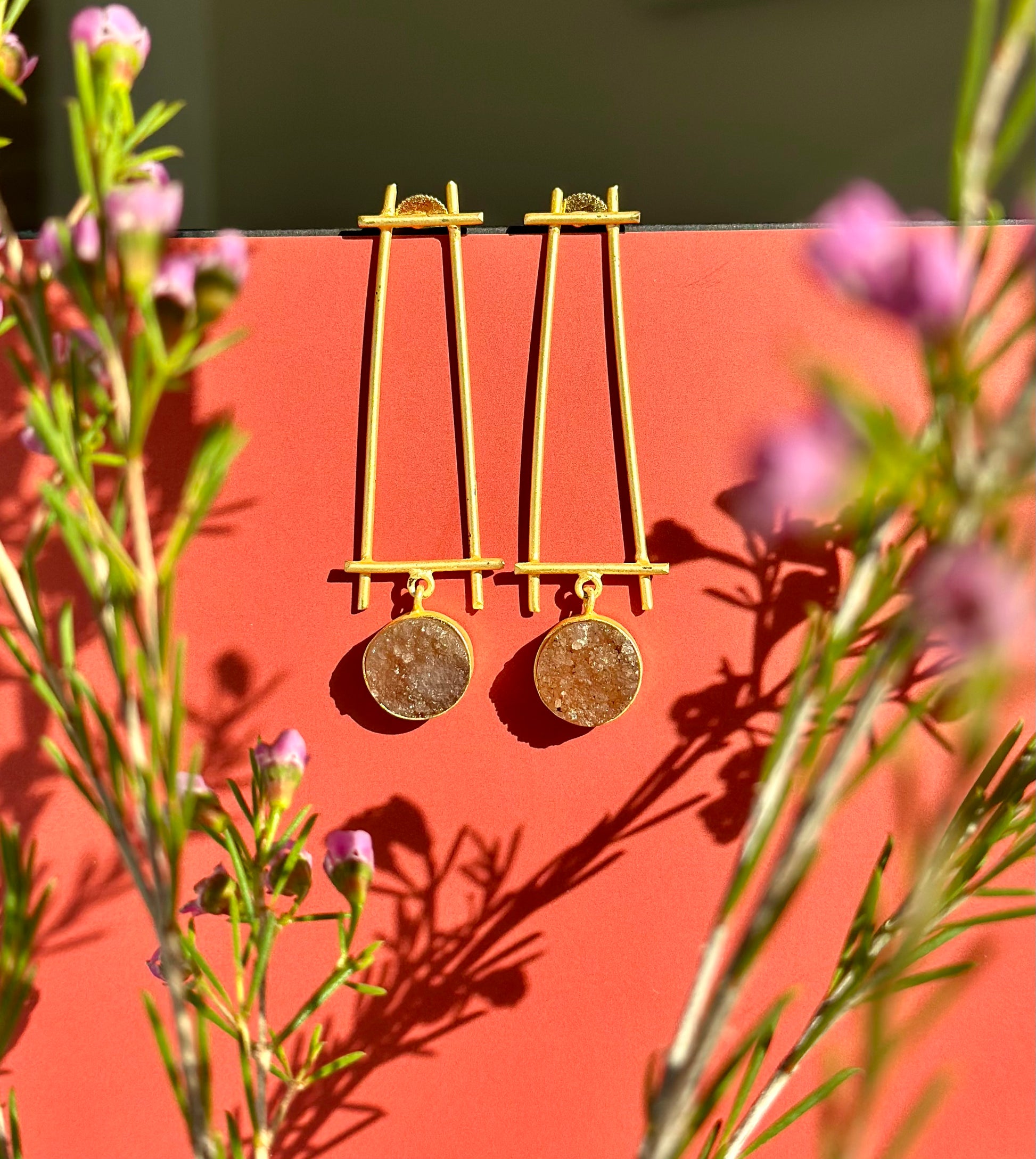 Architectural drop earrings in gold tone brass with a slender twin bar frame and a round champagne druzy charm. They sway and catch the sun. Secure post backs. Statement length yet airy. Pair with slick hair for a modern look.
