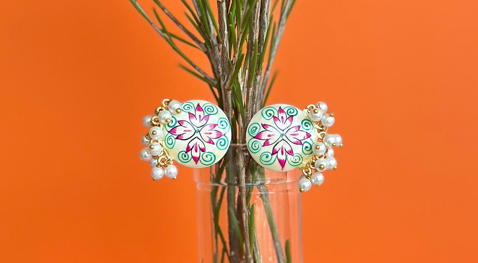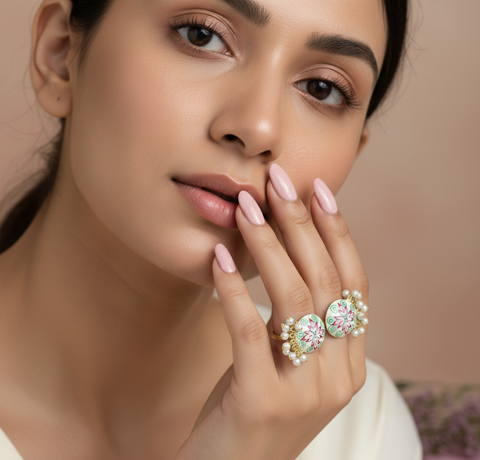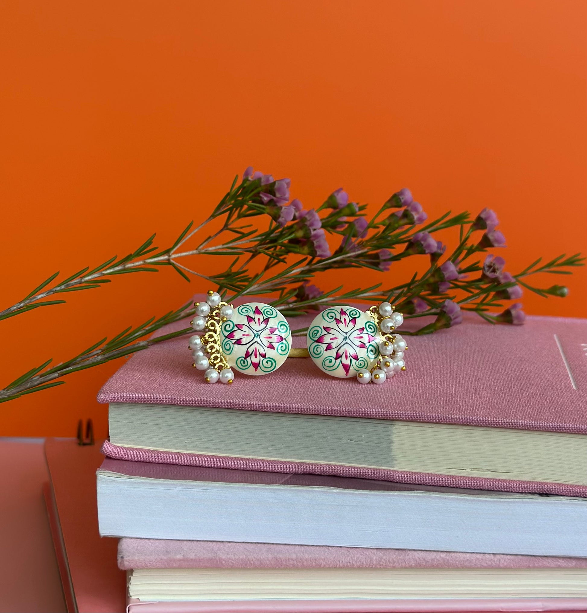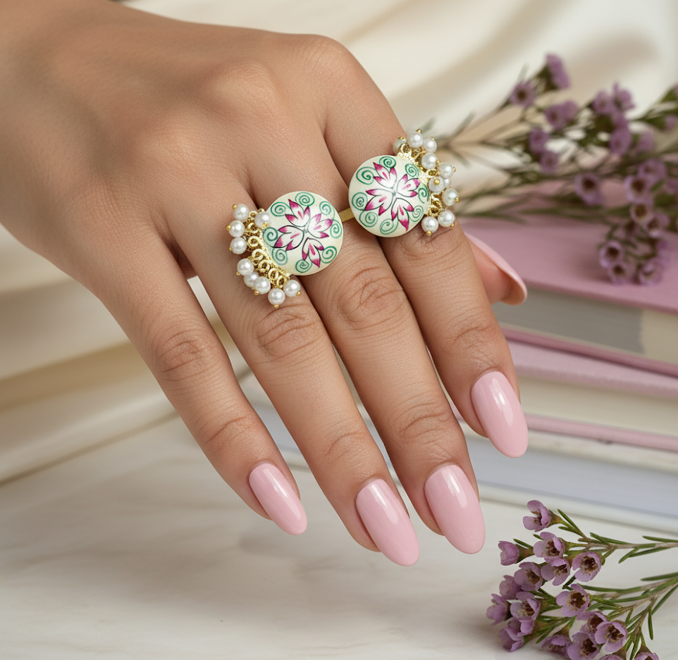 A round mint enamel blossom with rosy petals sits on warm gold-tone brass, finished with a playful fringe of tiny pearls. The open band adjusts comfortably, making this a soft, festive statement for daytime events, mehndi nights, and weddings.