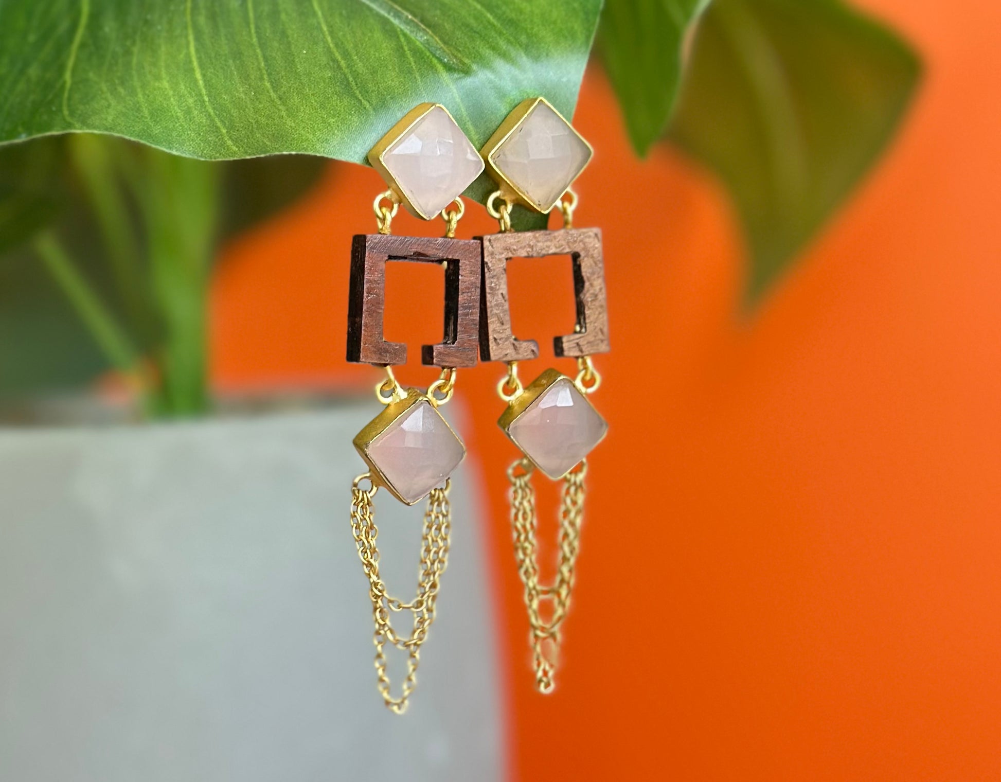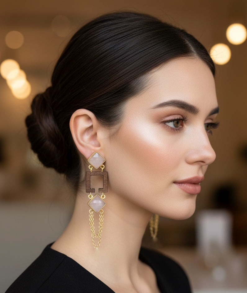 Blush resin studs frame the ear and anchor a sculpted wood square with soft gold chains that move. Light to wear with secure post backs. A modern mix of texture and glow for dinners, parties and gifting.